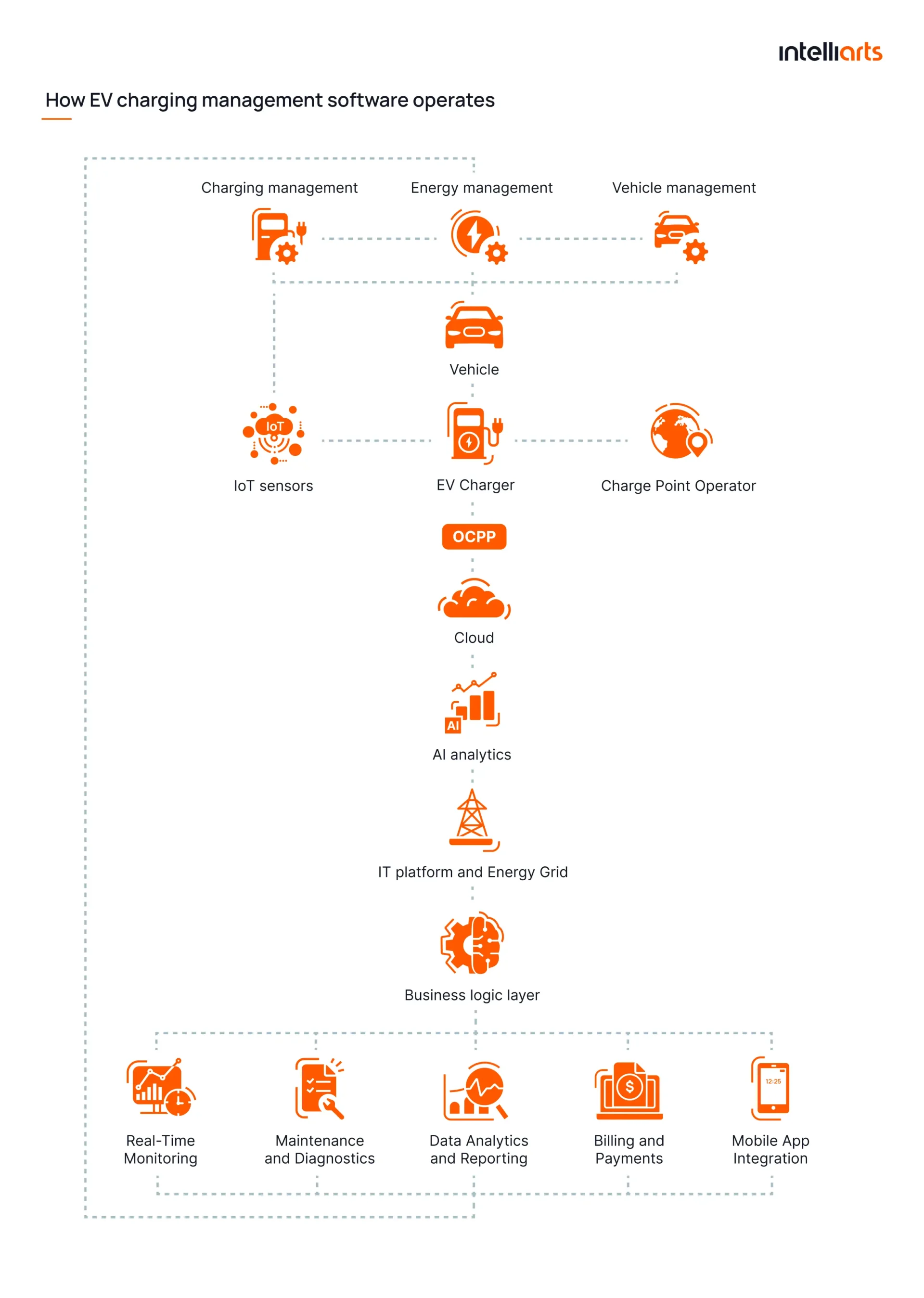 Note: The infographic and the instructions illustrate one of many possible approaches to structuring a flow of data with an EV charging management software in place. In certain scenarios, some components like mobile app integration or vehicle management may be absent, while others, like regulatory compliance, may be added.