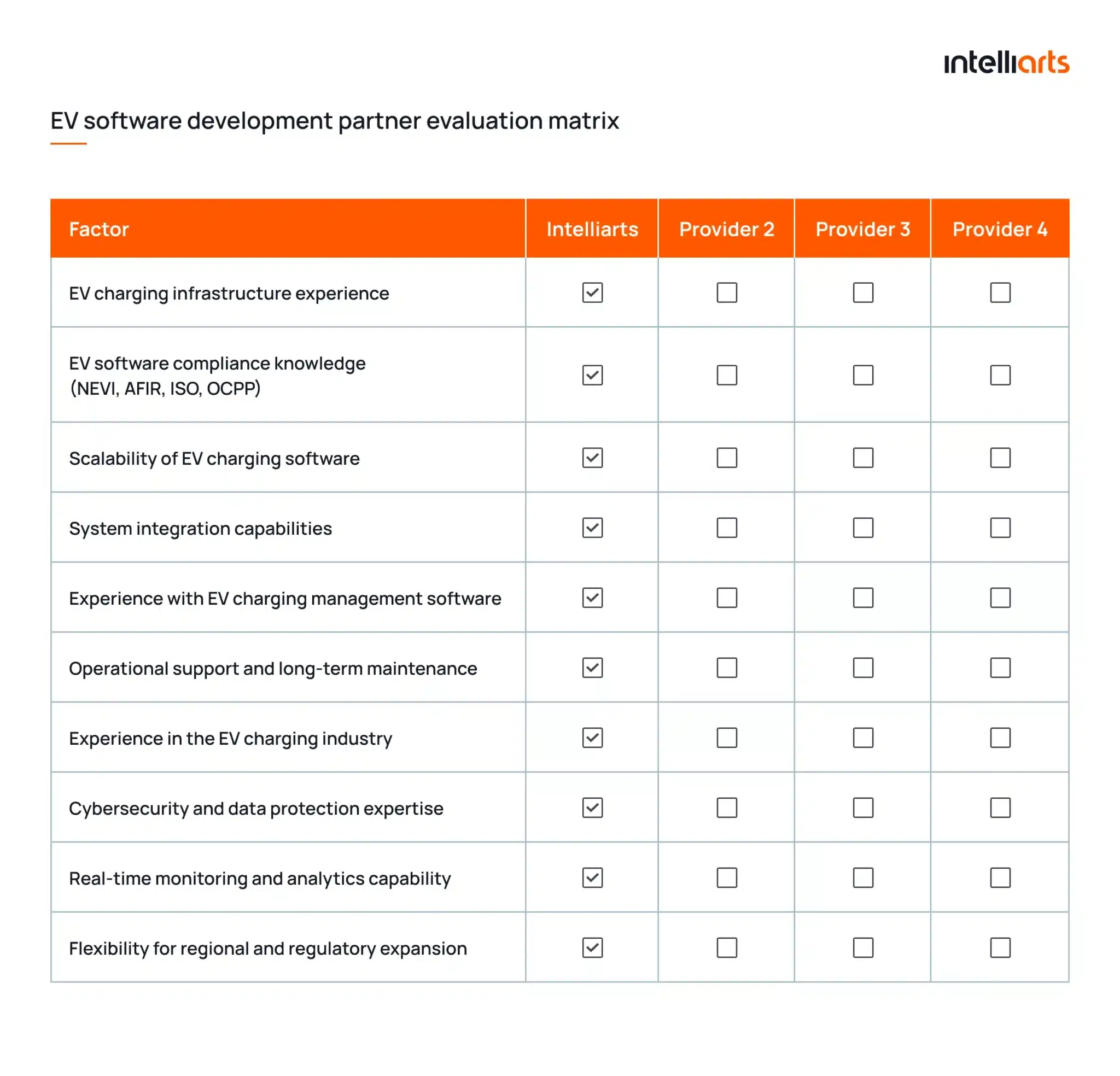 By providing EV software development for more than 9 years, Intelliarts has been able to form a framework upon which businesses evaluate providers in the EV niche. Here’s a list of key factors: